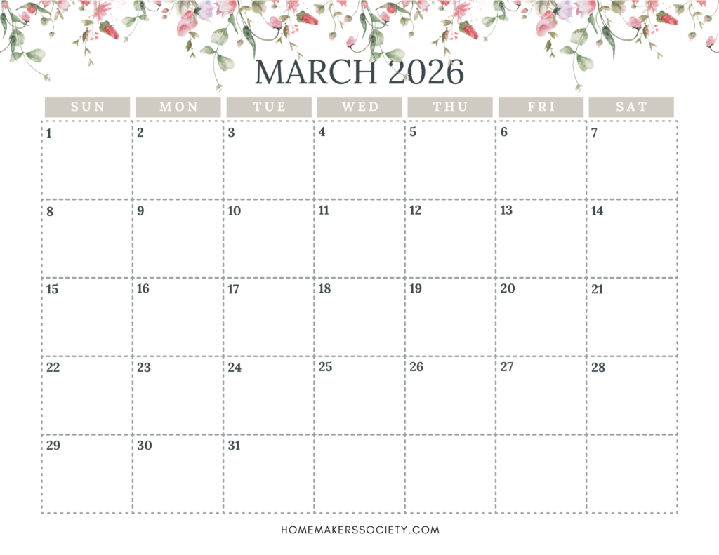 This printable includes 12 full monthly calendar pages for 2026, each with a soft seasonal floral design and plenty of open space for writing.